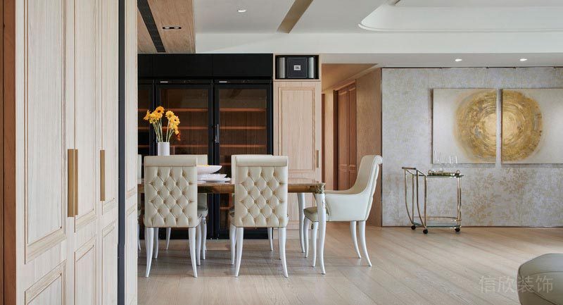 餐廳的擺放,實用性和功能性強,開放式的廚房,原木元素的酒柜;讓一切都能徹底的放開,不受任何的約束。