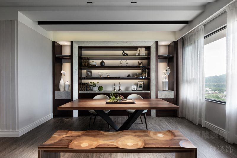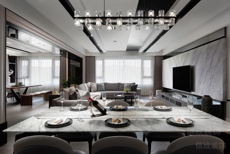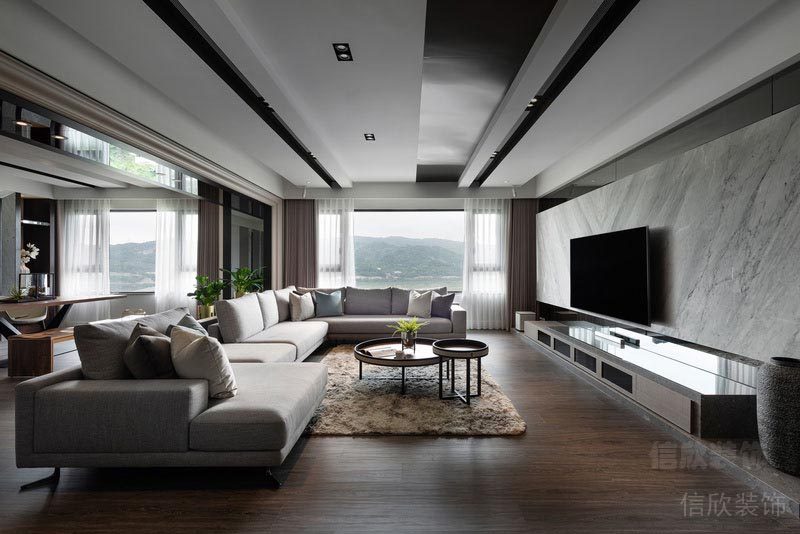 步入客廳一眼望去是一面天然大理石的電視背景墻奢華感極強,配上布藝沙發,加黑色金屬線條裝飾的簡約吊頂,中性色的木紋地板;頓時讓人一掃疲憊,身心愉悅。