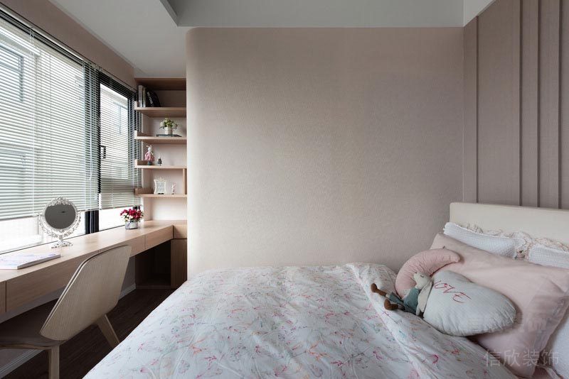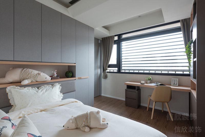 兒童房選擇光線和采光都非常好的一間房子,可以看出父母對孩子滿滿的愛和希望,暖黃的壁紙配上北歐風的一體式衣柜和書柜,深色的木紋地板;滿足了實用的特點,不會順著孩子年齡的長大而過時,永遠都有那份家的驚喜在為你守候。