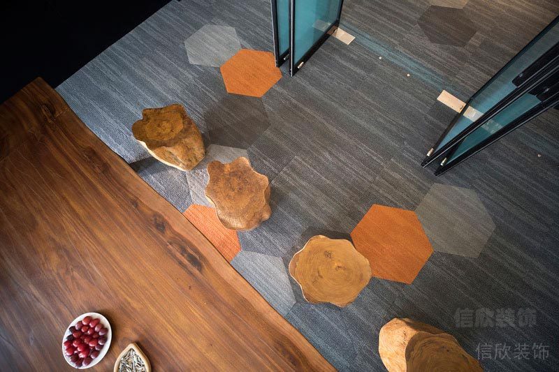 經過安靜有序的連廊,行至董事長的辦公室,手工編織的地毯,自然紋理的家具,形態各異的瓷器,無不透露出設計美學的理念。