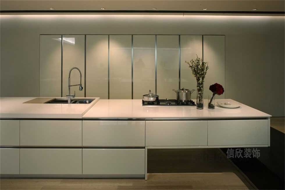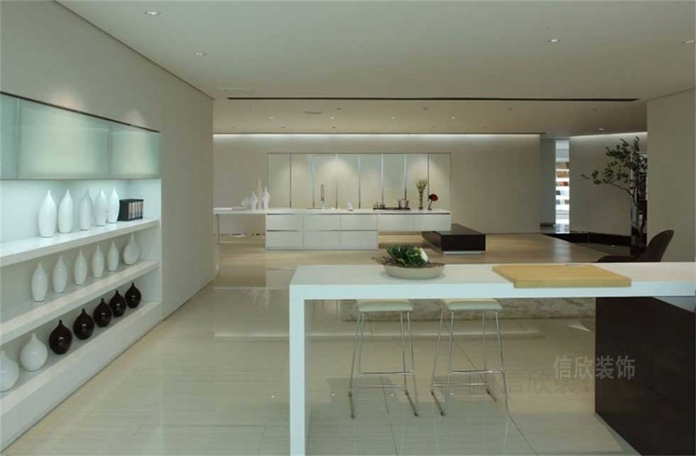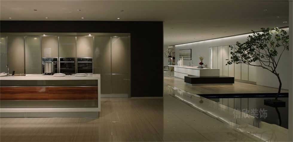 素雅的米色地面,符合現(xiàn)代人的審美特點(diǎn),玻璃材質(zhì)的壁柜,簡約中富有時(shí)尚高檔的氣質(zhì),黑色和白色結(jié)合的中島柜,兩邊做碗筷柜,中空隔板早餐臺的設(shè)計(jì)模式,新穎使用功能性強(qiáng)。