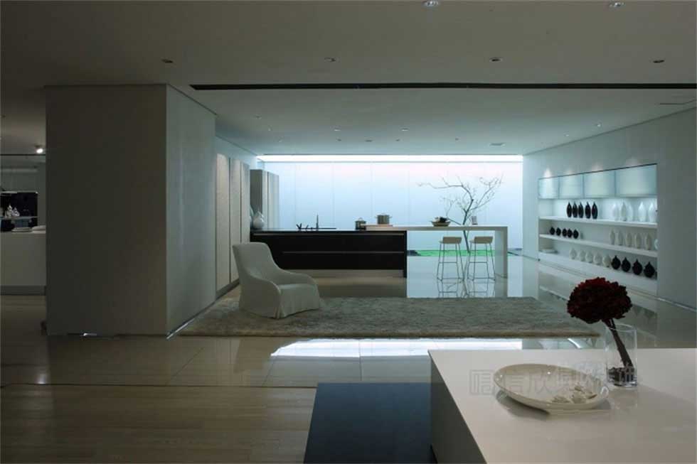 淺色原木風(fēng)的木地板,搭配白色調(diào)的整體空間,地毯的巧妙應(yīng)用,增添了一份只屬于家的溫馨感覺,黑白的中島臺可做為一見藝術(shù)擺件,也能作為燭光晚餐和早餐臺來使用。