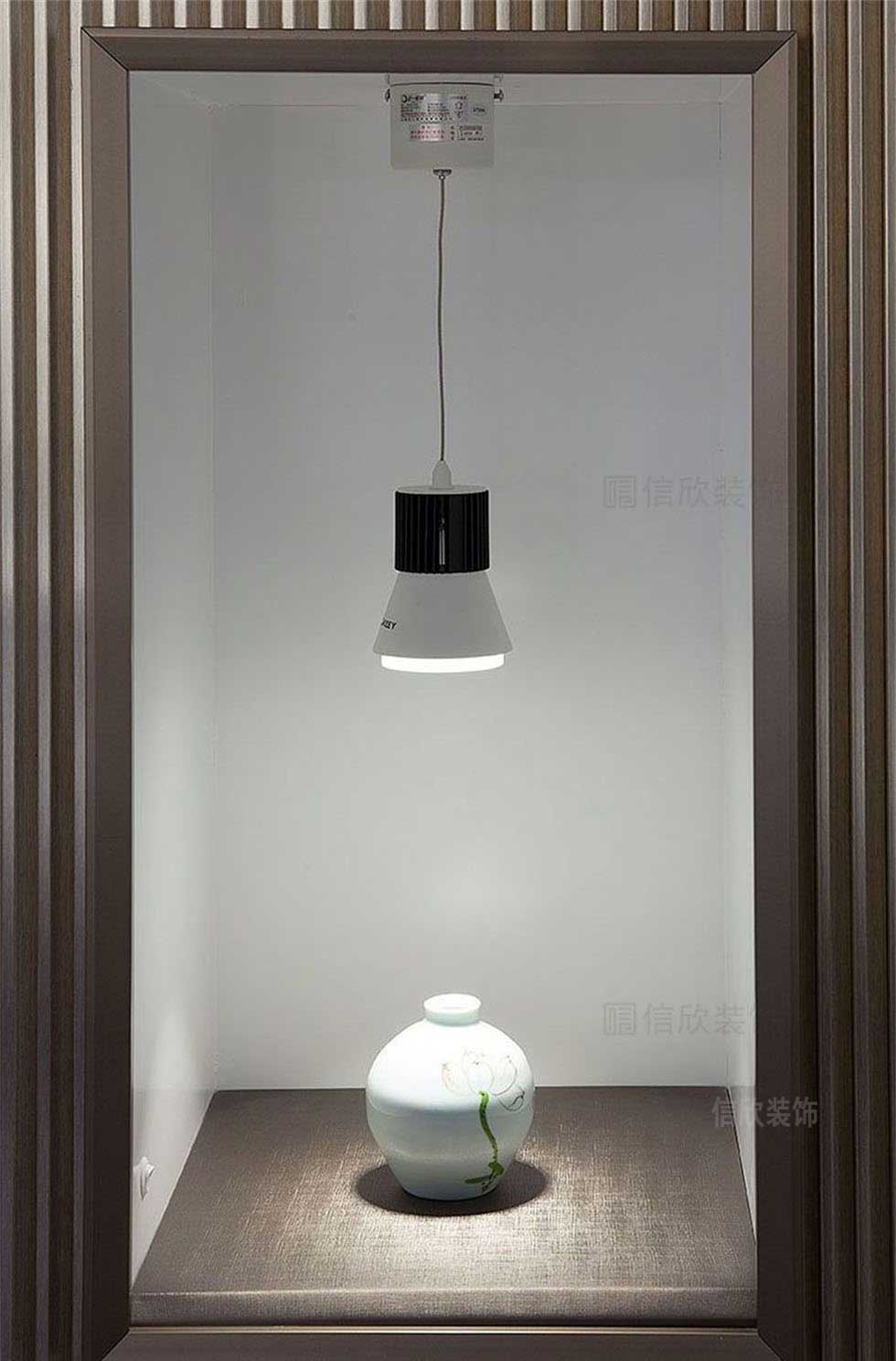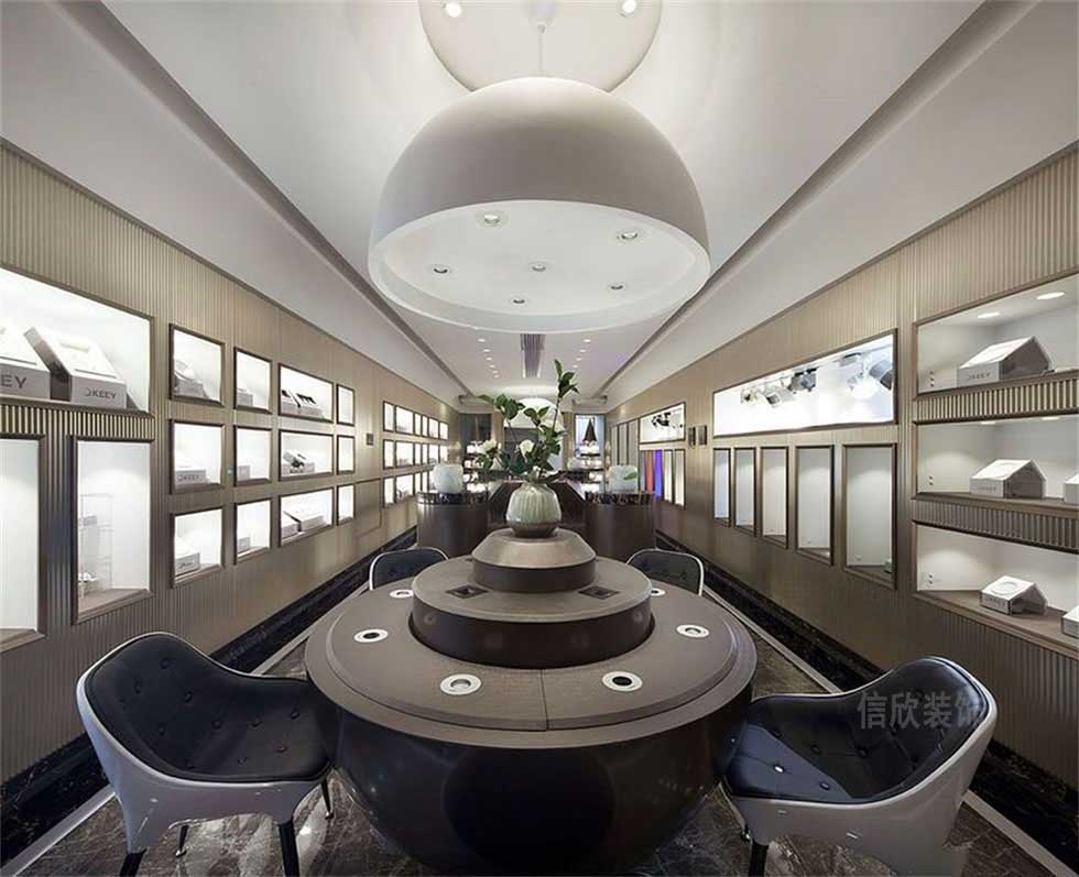 白色的頂面頂燈,對應深色石材紋理的地磚和三層層次感分明的展臺,既可以作為燈具的展示操作,又是一個洽談的小圓桌,把現代科技感和時尚美觀相結合的設計方式。