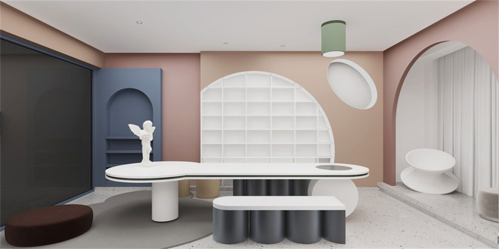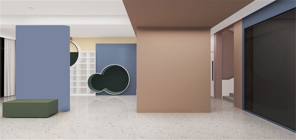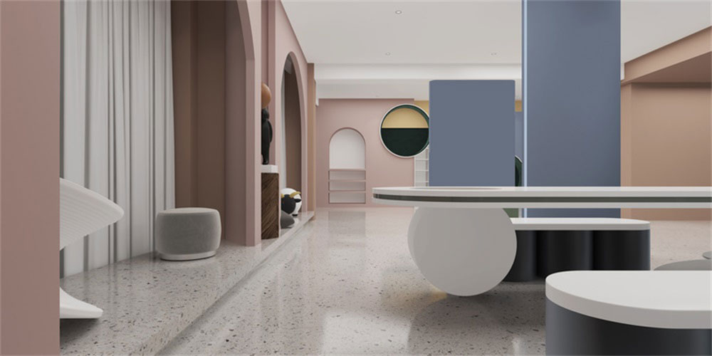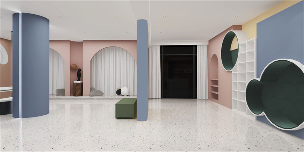 前廳的設計上,采用了半圓形拱門式的設計,更偏重于卡通的感覺,整體色彩的應用簡單,通過朱紅色,藍色,白色的相互對比和襯托,讓整體感覺形象生動。
