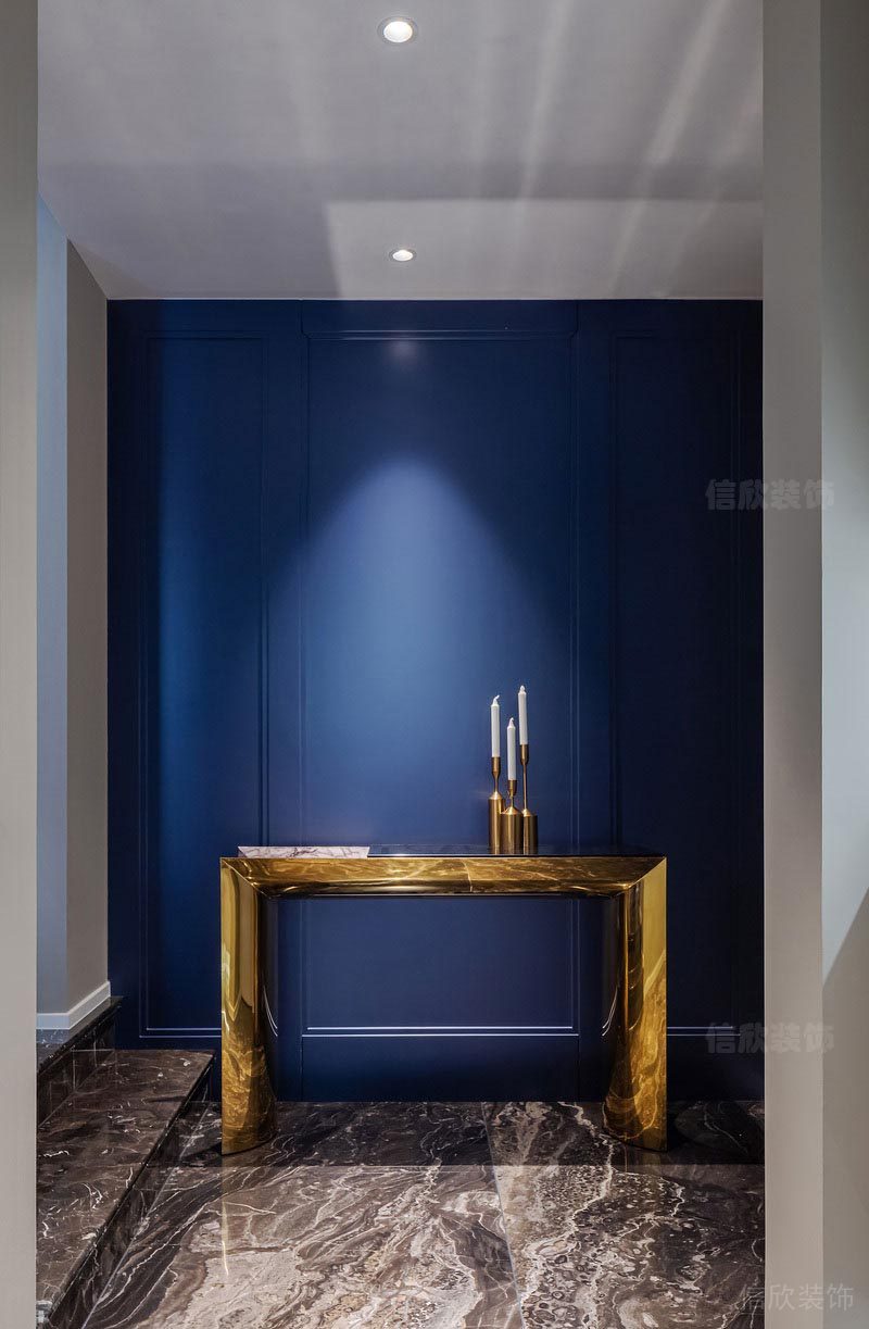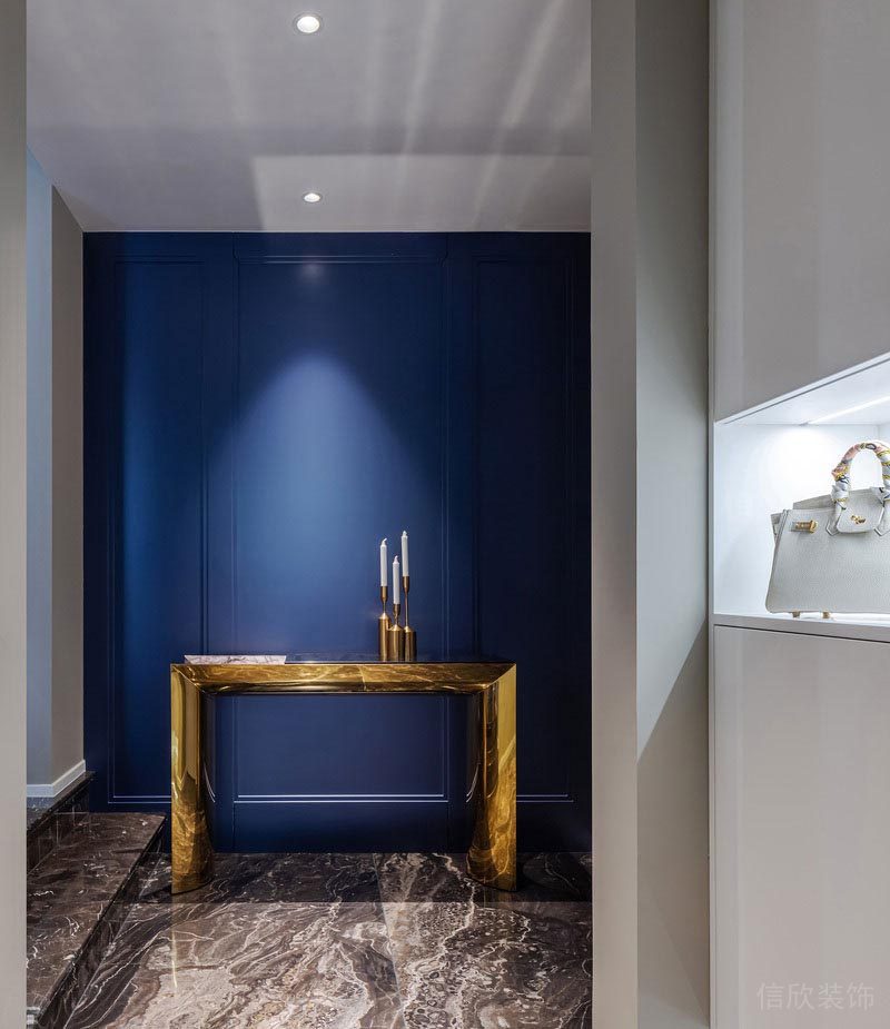 本案的玄關,選用杏色的壁紙作為墻面的基調,配上歐美貴族式的藍色在背景墻色調,金色金屬和天然石材的玄關柜把奢華感拉到了極致。