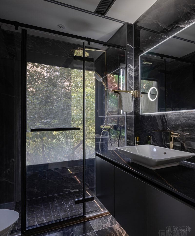 黑色紋理的墻地磚,同樣黑色的浴室柜,加玻璃做了干濕分離的衛生間設計,在功能性的區分上達到了合理方便的原則,深色的大面積的應用則體現出獨特霸氣的歐式輕奢風特點。