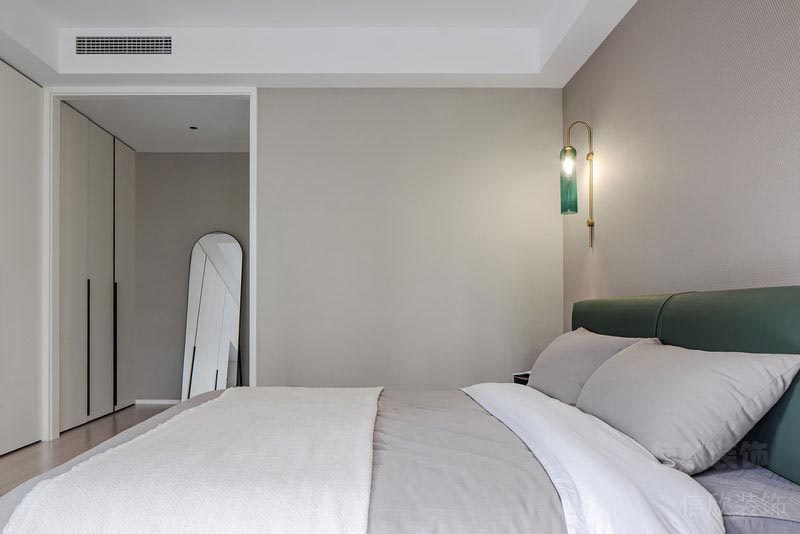 次臥室采用了一體式的白色衣柜和灰色寫字桌混搭,簡單的淺灰壁紙和米色的床頭背景墻壁紙相區分,適合的布藝床,體現出現代簡約風中,簡單,低調,實用性極強的特點。