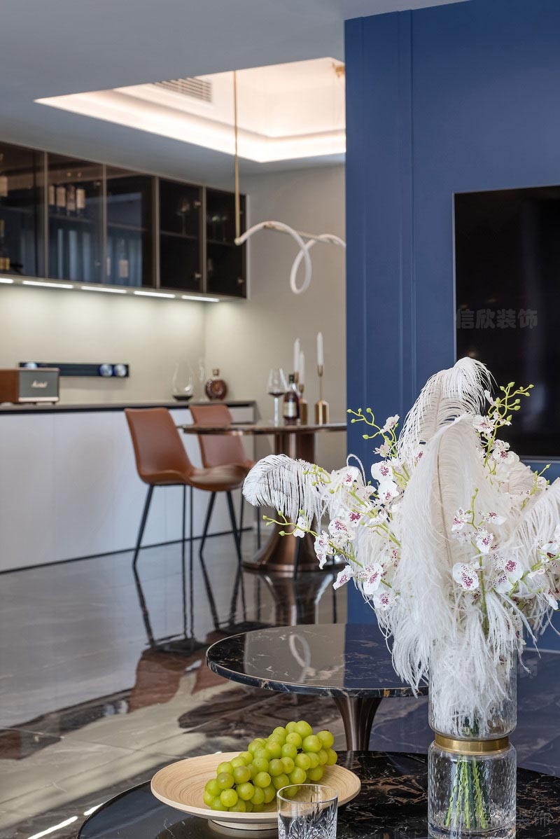 客廳藍色的背景墻,三角形帶量的吊頂,深咖色石紋地磚,專屬于貴族氣質的天鵝絨布藝沙發;無一不散發出瀟灑又桀驁的歐洲古典貴族氣質。