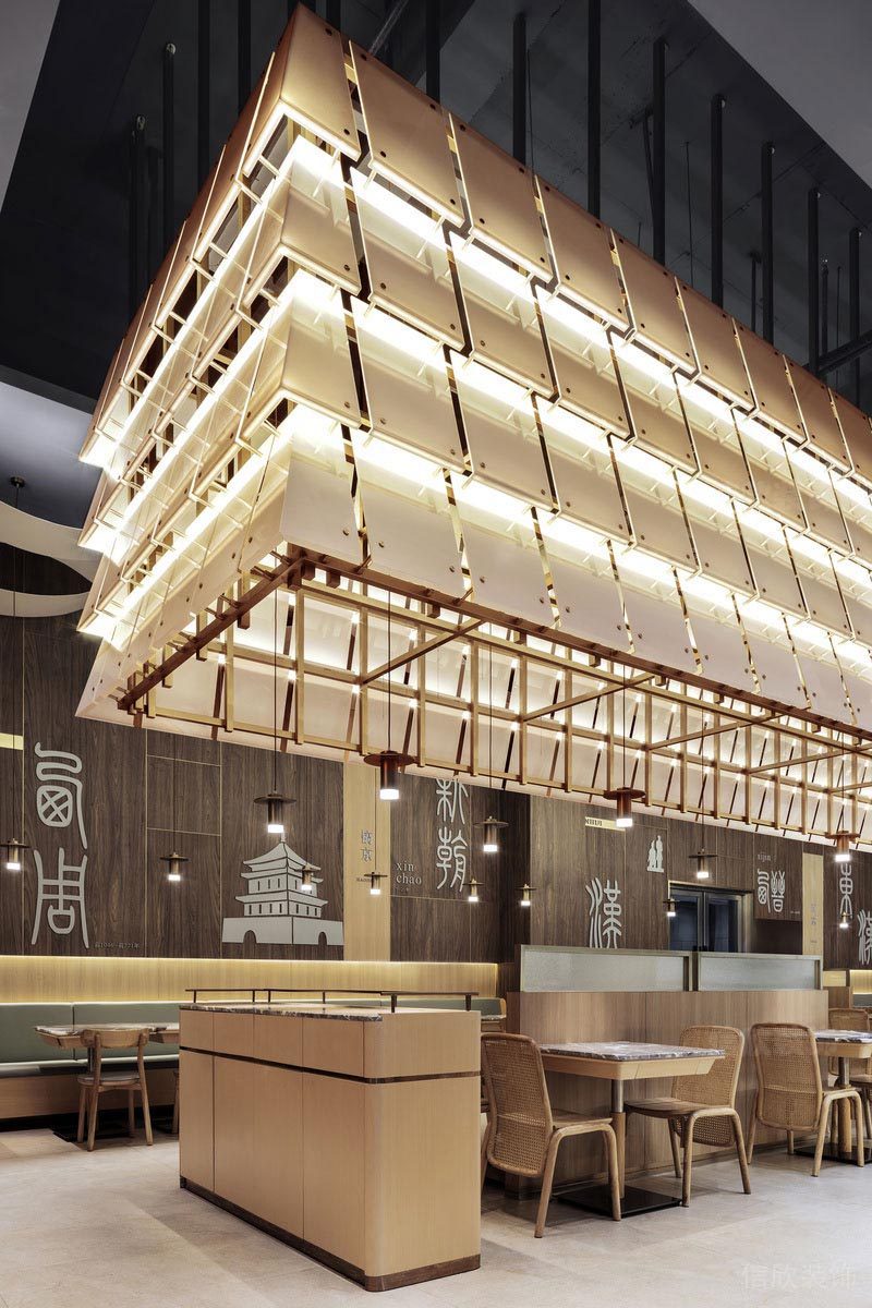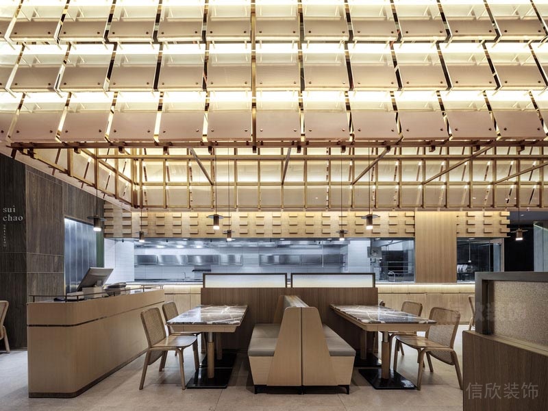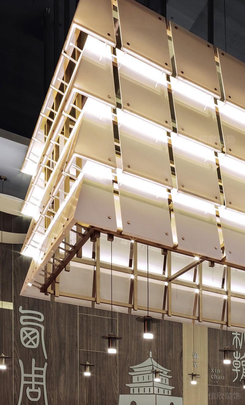 本案位于深圳市福田區是一座新中式的面館裝修設計案例,設計師將厚重的歷史文化用現代材料及手法融入餐飲空間設計之中,從兵馬俑的鎧甲獲取靈感,將一片片鎧甲重新排列組合形成陣列的秩序感,震撼且新穎,給空間一個全新的符號,讓你一眼望上去滿是歲月風過往,五千年的輝煌,五千年的滄桑;全部濃縮在了這一碗面里,讓你回味無窮,感慨良多。