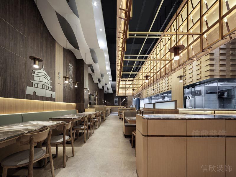 深圳市福田區面館取餐區背景墻 明檔上方采用城墻的方磚排列,配以凹凸木飾面代替沉重的灰色磚墻,提升了空間的質感和視覺舒適性。
