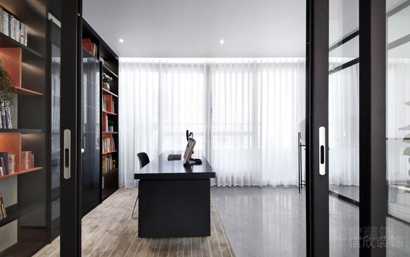黑色的書柜,現代的書桌,白色的窗簾,黑白搭配這個永不過時的話題,讓您的書房簡約而不簡單。