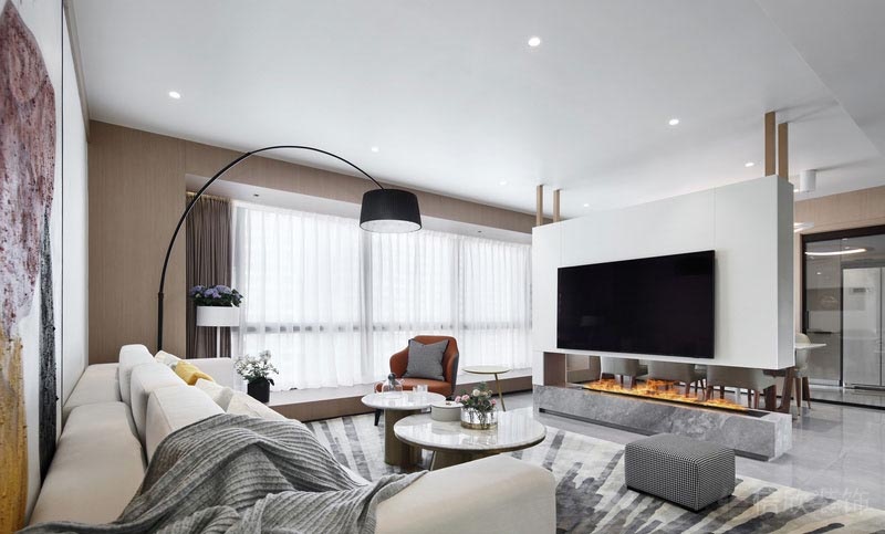 隔墻式的電視背景墻,灰色的石臺,白色的基體,熊熊燃燒的壁爐,勾勒出一副北歐式的浪漫畫卷。