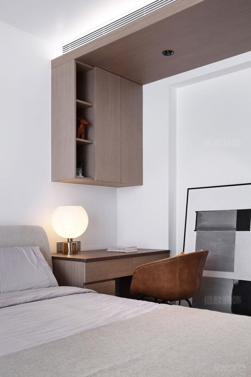 壁紙和木紋結合的背景墻,干凈,清爽的床單,現代感十足的吊燈,色調冷而溫馨,家飾簡而時尚。