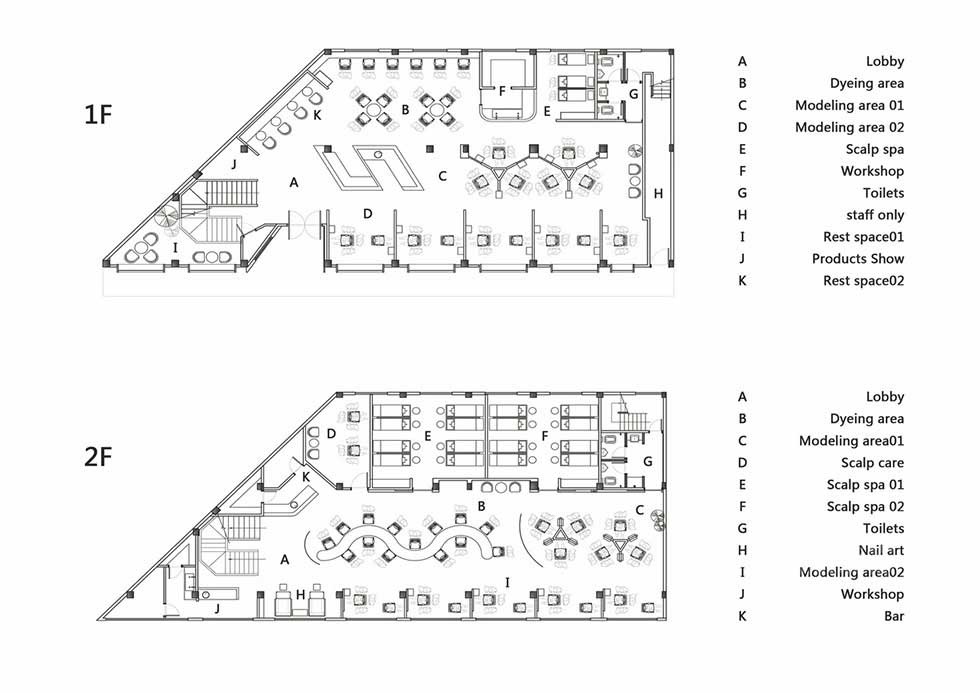 人們在專業理發店的時間及密度正逐年穩步增長,截止至2019行業權威統計數據新女性消費群體每年至少到沙龍接受專業沙龍服務不少于90+次,男性消費者普遍也保持兩周即到發廊接受專業造型服務以保持個性形象,這是一個高頻率的市場行為,降低容積率以換取體驗者更優質的沙龍體驗,也為發型師提供了更獨立的創作環境。消解切分并強化了個體在集體中的共存感。