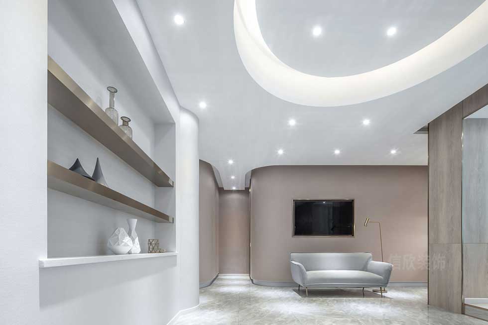 二樓大廳整體空間,我們營造了一種居家放松舒適的空間環(huán)境。采用木飾面裝飾,賦予空間一絲溫度。天花板的圓形吊頂,寓意著圓潤和諧