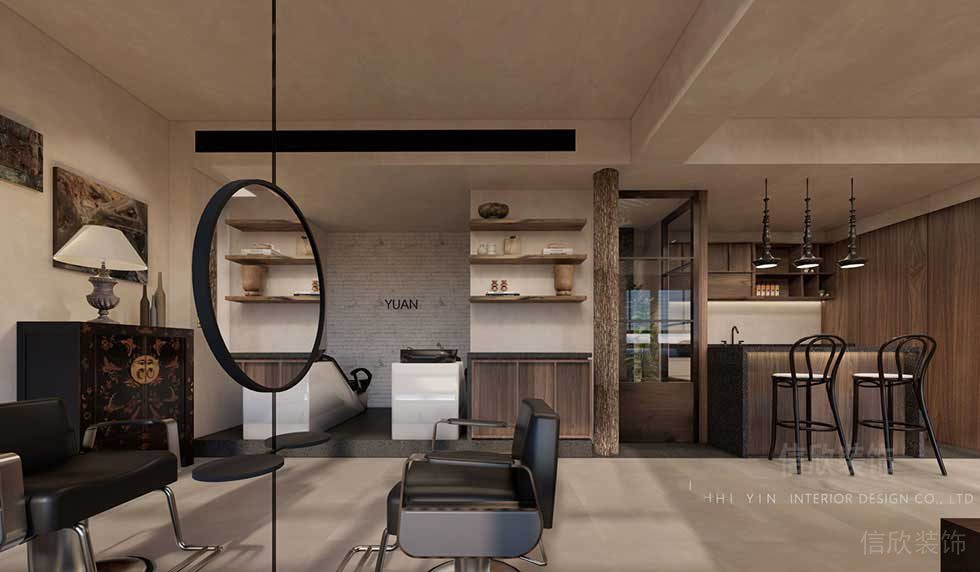 洗頭區設計中會所的盡頭,文化石的背景墻,黑色加高的地臺,實現了功能上的分區,同時也給人一種對過去的歲月和舊時光的懷念之感。