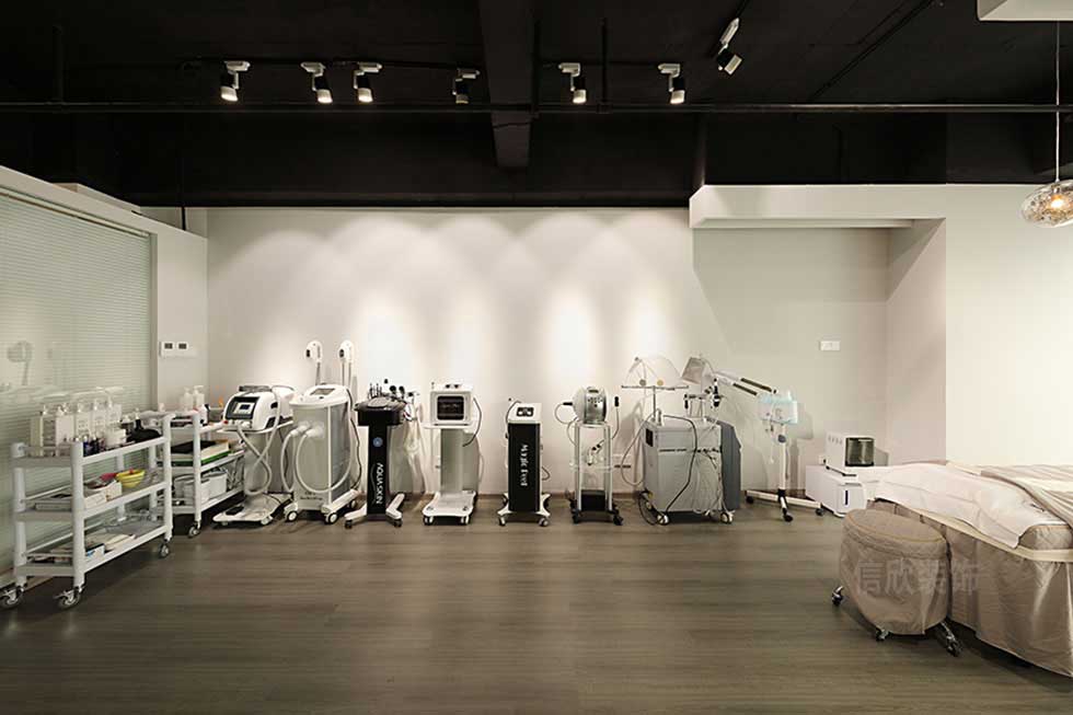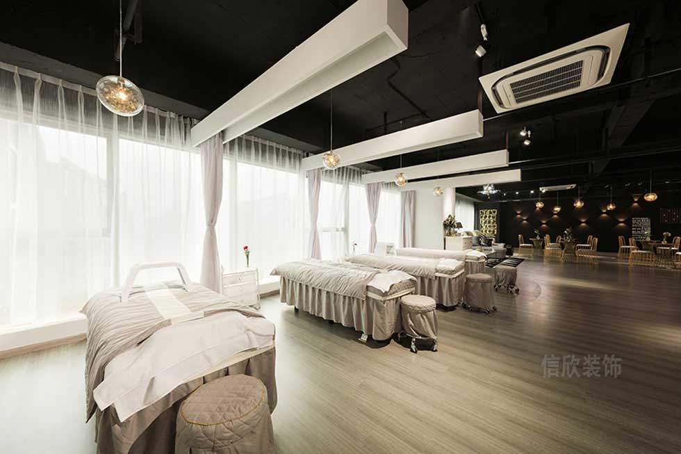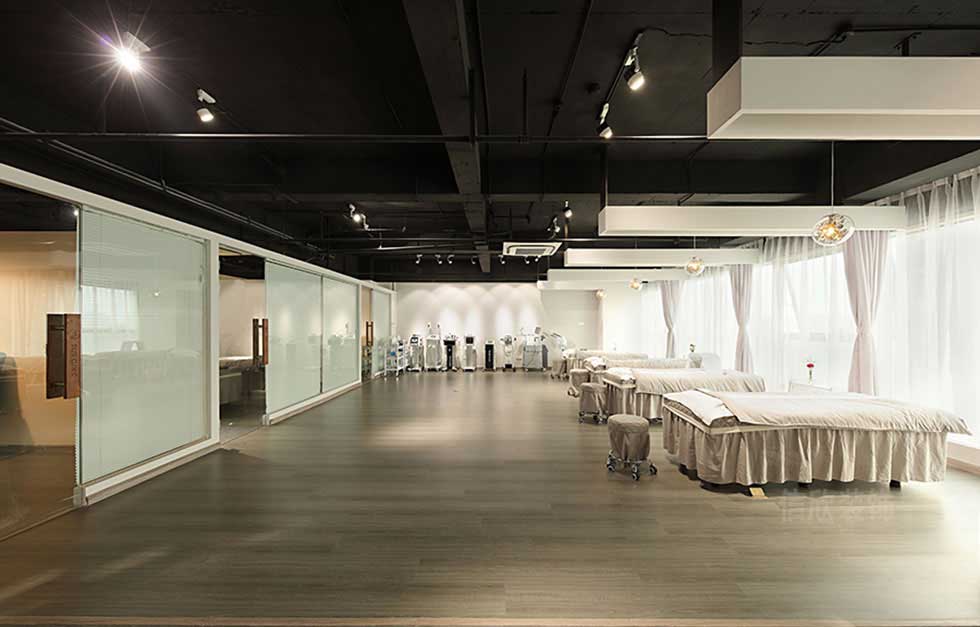 黑色時尚美容店美容區裝修設計 落地窗式的設計,把光線能夠完美的引入室內,明亮通透,光線飽和度高,讓整個空間的寬敞度得到一個提升,原木紋的地面和美容床,和黑色的頂面做了一個區分,既有工業感的粗獷,也能體現出簡單自然的清新和時尚美感。