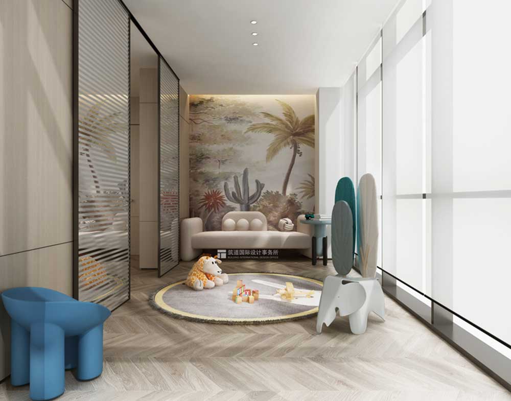 二層 | 兒童娛樂區(qū) 兒童休息區(qū)以輕奢風(fēng)格為主,添加玩具等裝飾,更加活力。 為什么設(shè)計兒童娛樂區(qū)?——前面也有提到業(yè)主是一個90后海歸,有一個孩子,因此考慮到孩子的問題,就設(shè)計了一個關(guān)于兒童的區(qū)域,辦公的同時也可以兼顧。