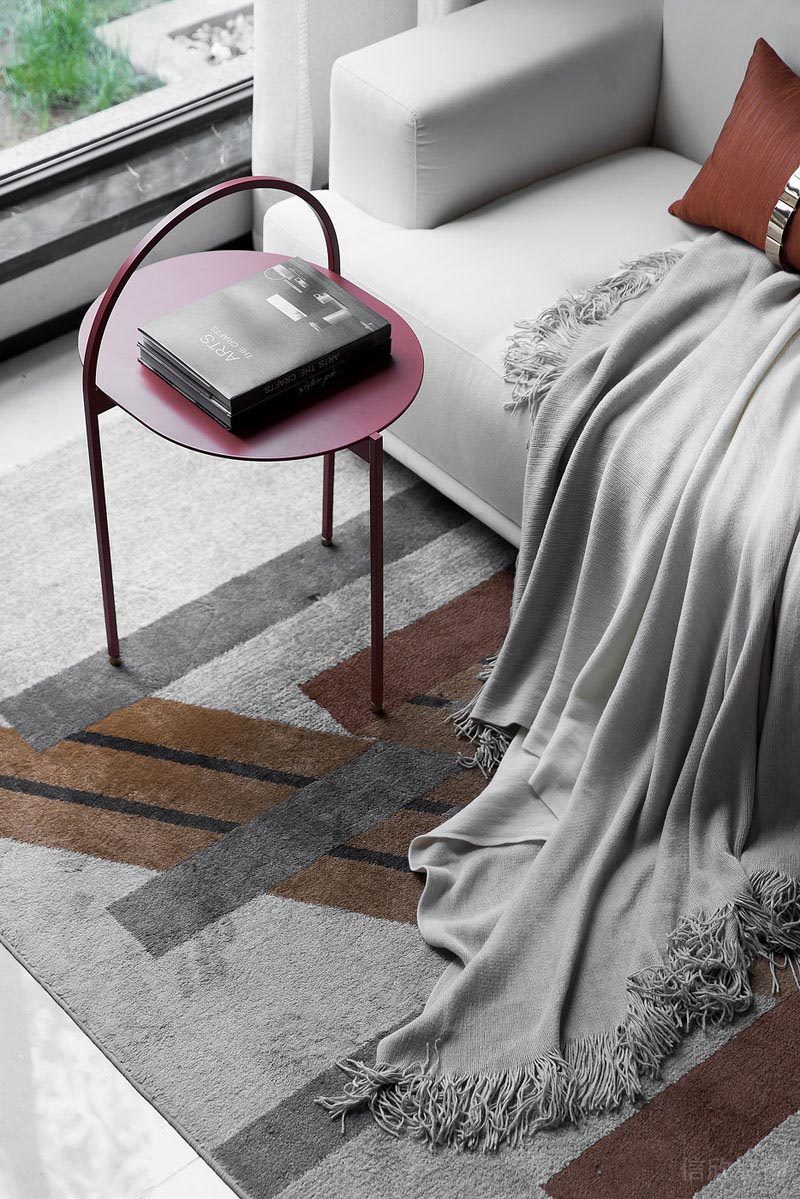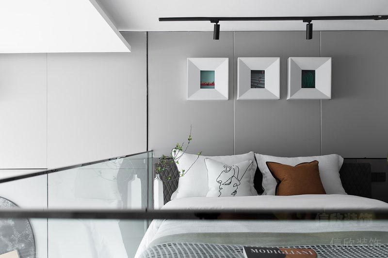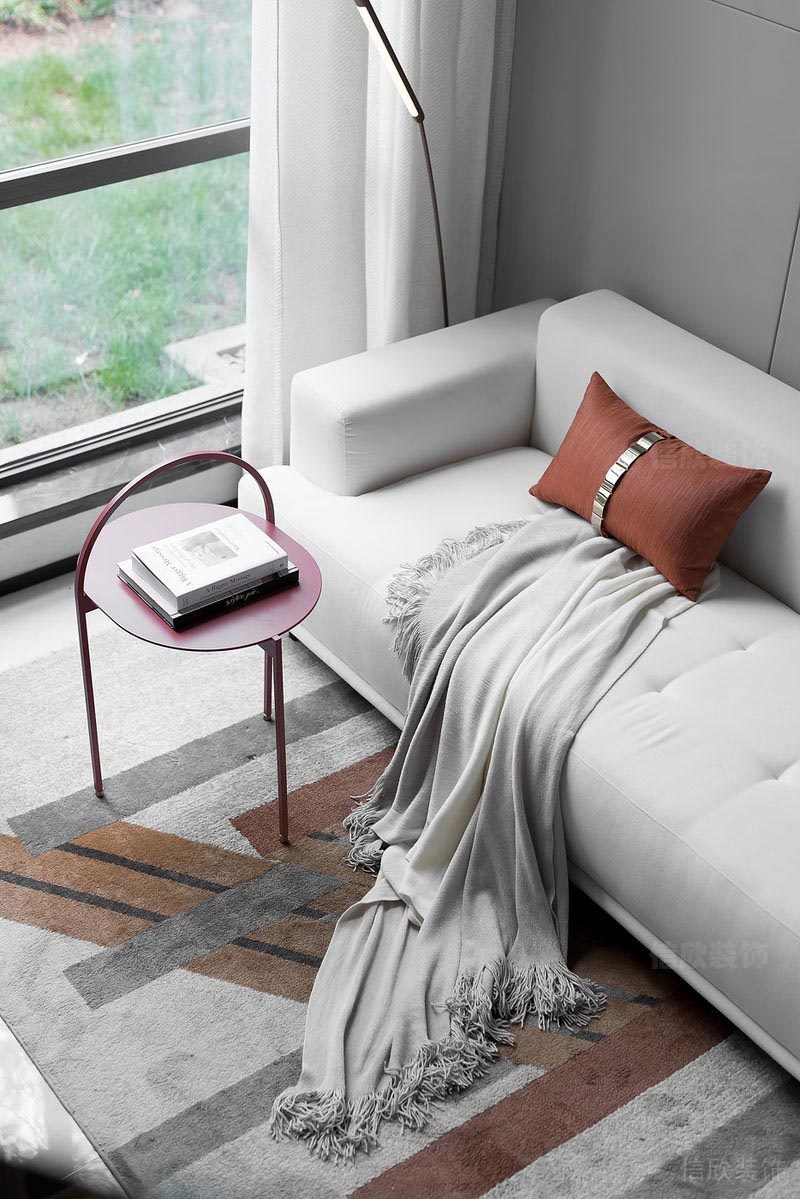 灰色的硬包,淺灰的地面,白色的沙發,表現出后現代簡約輕快而不繁雜的生活方式,一副抽象的背景掛畫,點綴小眾化的審美情趣。