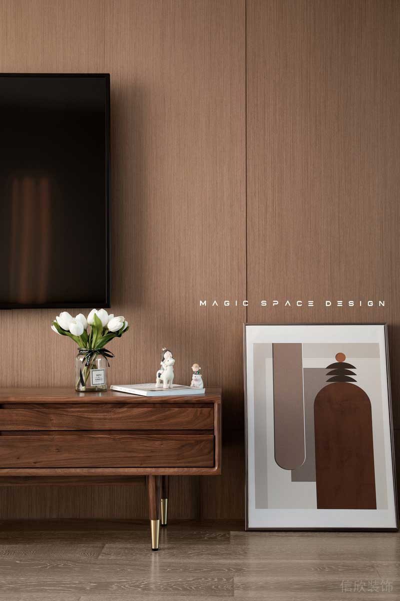 ?深圳龍崗布吉北歐簡(jiǎn)約風(fēng)舊房翻新改造裝修的客廳空間原木色的基調(diào)為主,木紋板構(gòu)成的背景板。