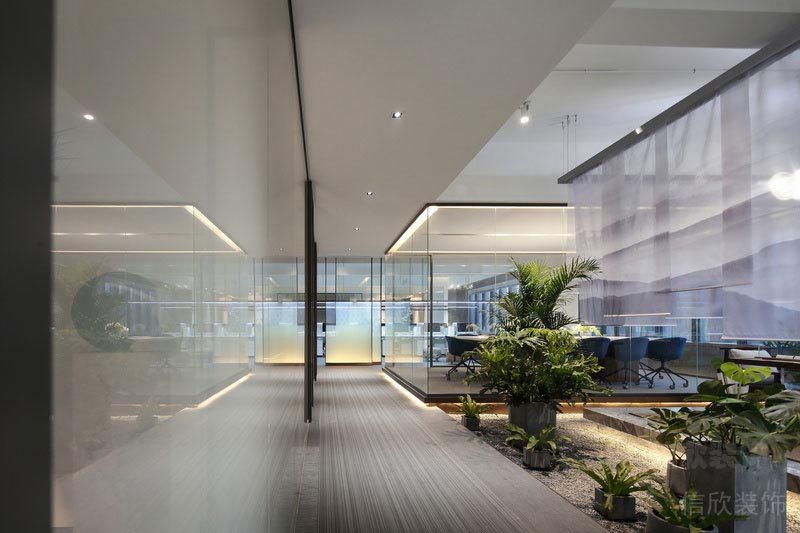 本案效果圖展示的是位于深圳羅湖區筍崗中心萬象華府的一個辦公室設計。有點類似于輕奢風的工裝設計,前臺選用大理石吧臺搭配格柵植物墻飾,展現立體自然感。整個布局繞著橫軸作為主通道展開,可滿足各個功能區的即時日常需求,用最純正的設計讓辦公空間更加舒適自然。辦公室內分散式設有綠植景觀,舒緩辦公室緊張的氛圍。空間的燈光設計設計師做到了該亮的地方亮,用燈光突出空間主要展示區域。