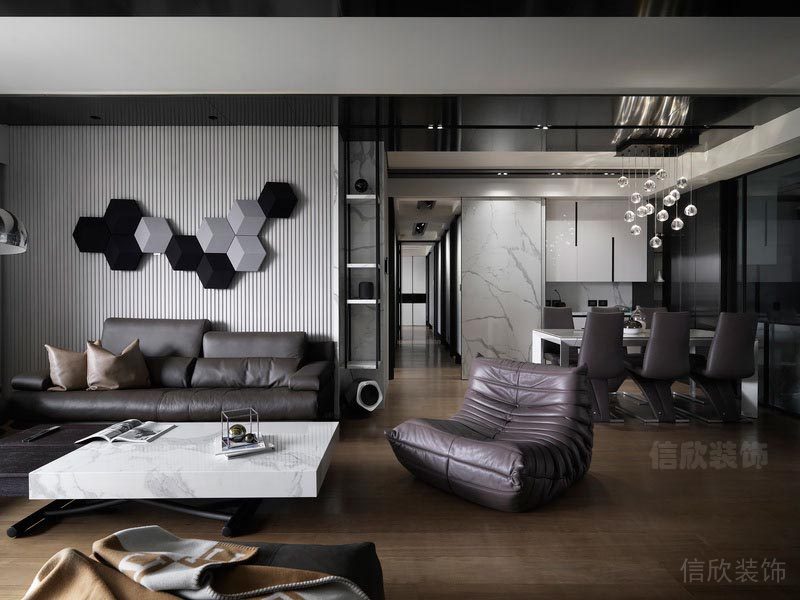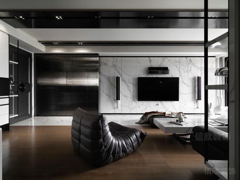黑白灰的客廳白色石紋背景墻優美高雅,白色的吊頂用黑色金屬線條裝點,注重線條的提煉,搭配幾何圖形的沙發背景墻,視覺沖擊感極強。