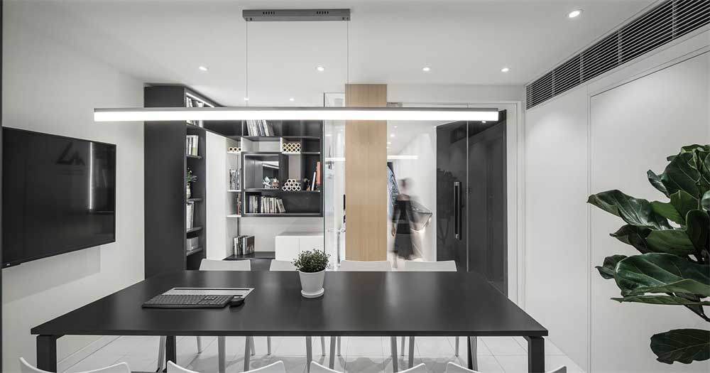 黑色的長型洽談桌,白色的椅子,中間LED屏幕,邊洽談邊和客戶講解,更能直觀的表現(xiàn)方案的魅力。