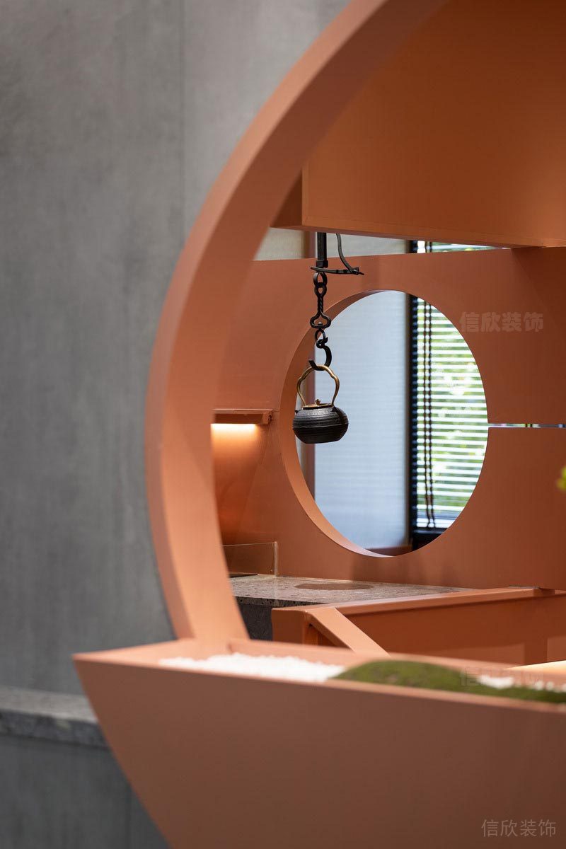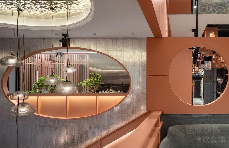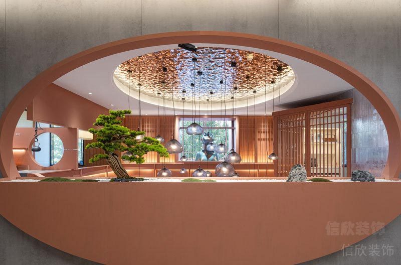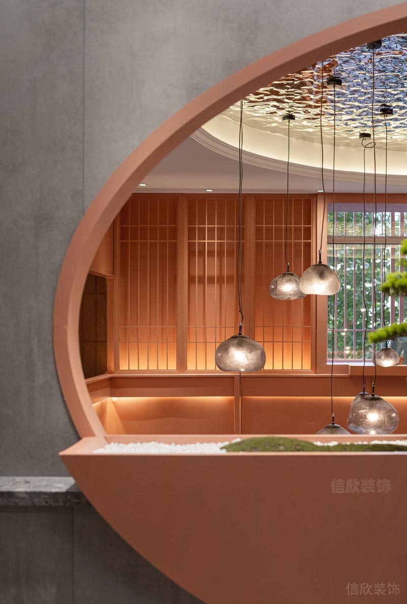 墻面上開了圓孔的隔墻,暗合天圓地方之意,開闊了視野,可以把陽光引進來,枯山水的綠植用餐之余,也是一道養眼的綠意。