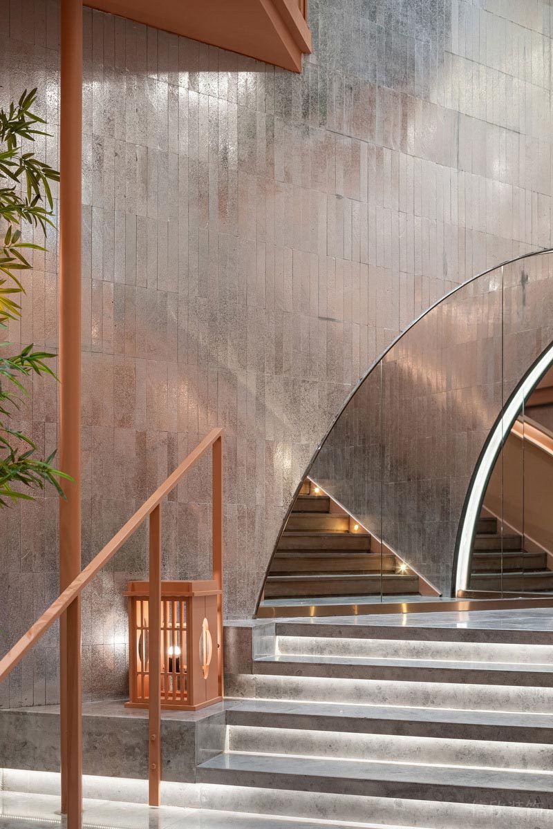 灰色的樓梯,在燈帶的裝點下,如山澗溪流在緩緩流淌,君子之風的瘦骨竹,在一輪明月的照耀下,如一副潑墨寫意的山水畫。