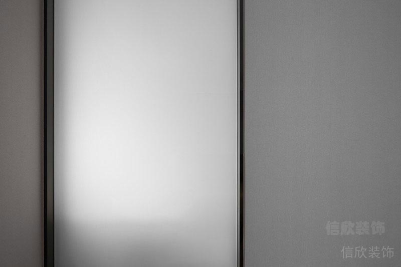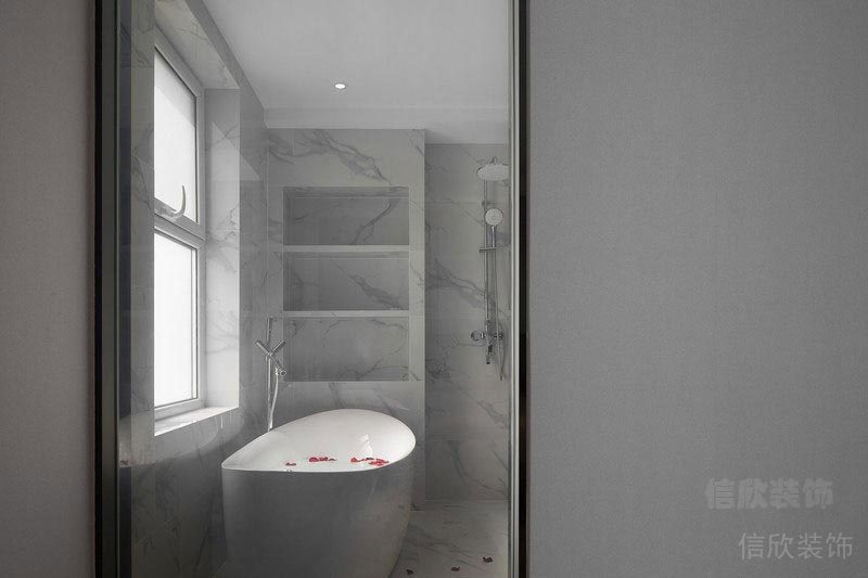 浴缸區與主臥墻面打通,使用電鍍霧化玻璃, 繼續放大延展主臥的空間感, 既能看到花瓣灑落弧形浴缸的優雅, 又能保證私密性, 為平淡生活增加更多情趣。