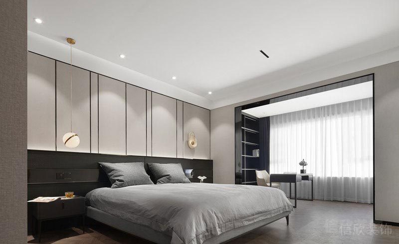 主臥室與陽臺通透延伸,直通湖景, 陽臺巧妙設計成書房區域, 靜謐沉穩,盡享私人湖光。 整體風格,簡約不失優雅與格調。