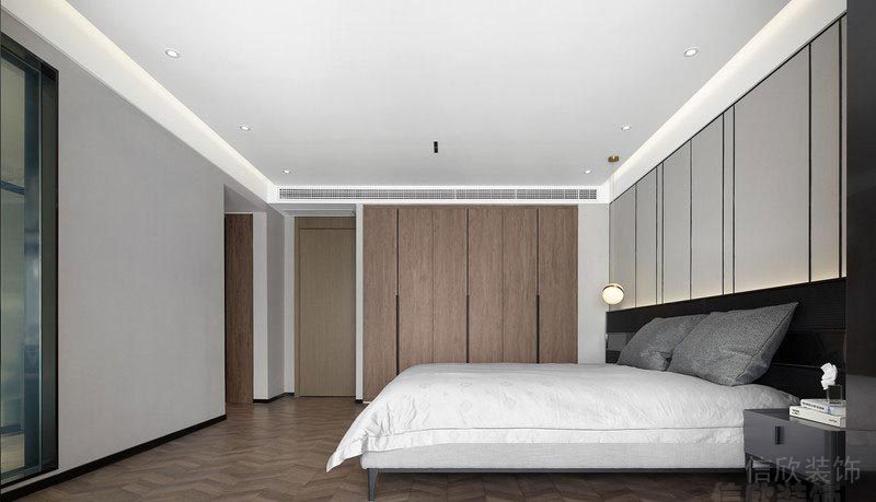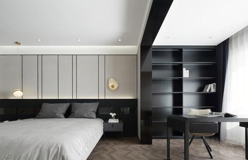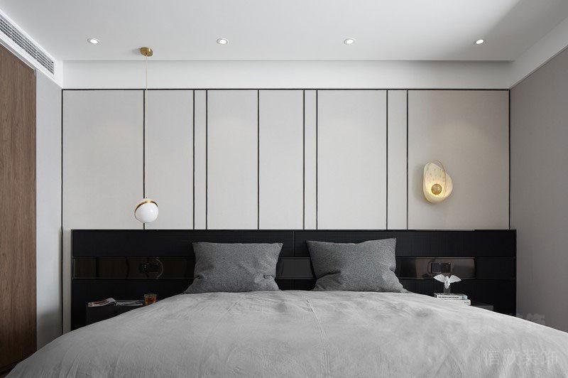 平頂懸浮與進口射燈代替傳統吊頂與吊燈, 床頭保持統一性與結構美, 內置交叉手工編織皮質包裹, 搭配不對稱設計燈飾, 既能體現空間的整體連貫,又打破呆板。