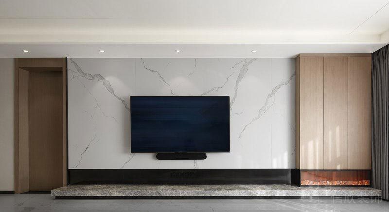影視墻儲物柜與左側房門顏色統一對稱, 儲物柜下增設壁爐調節墻面層次。 細節處藏納乾坤, 溫暖和煦于雅致間層現。