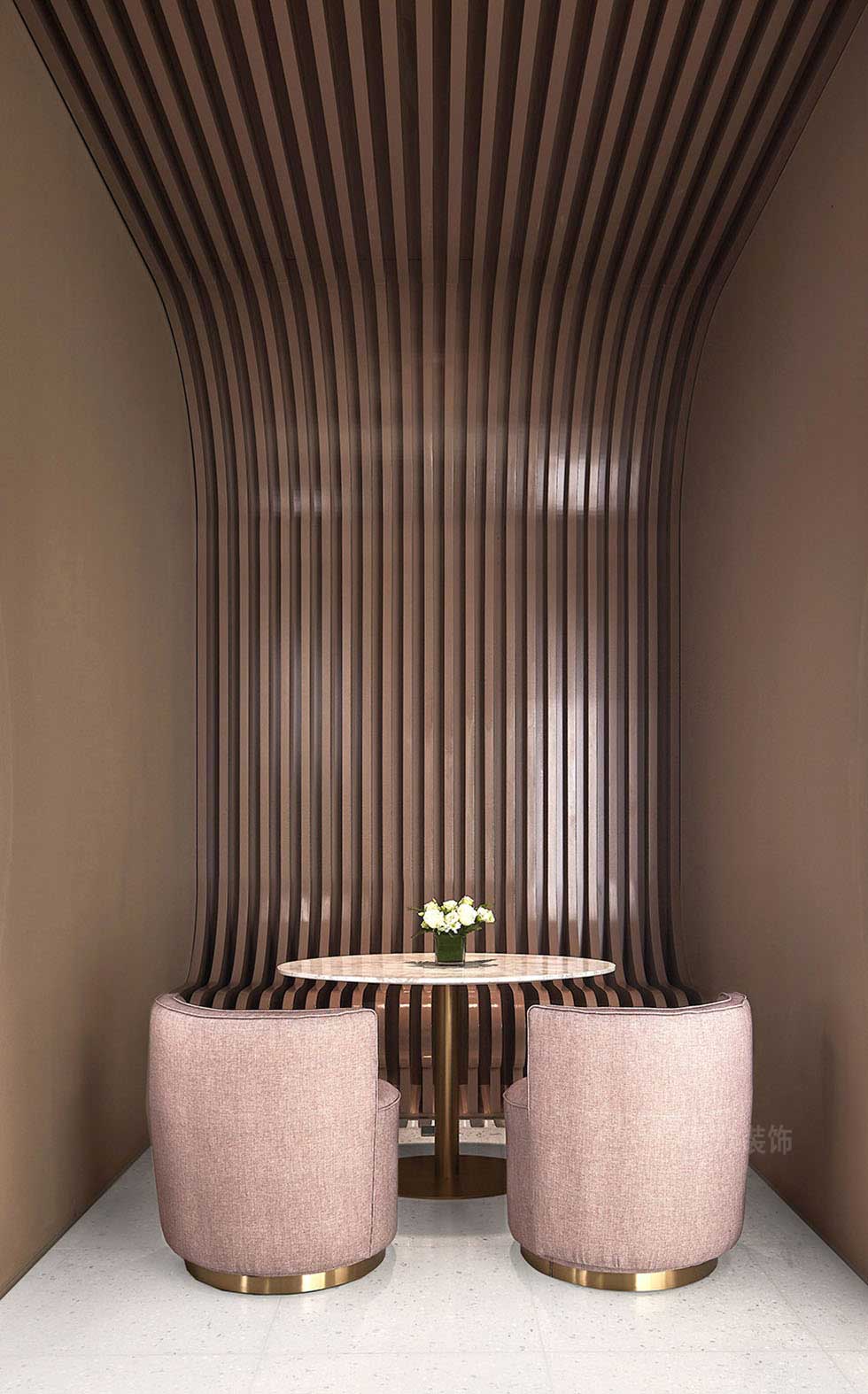 入口門洞的兩側,則為一對一的咨詢區,通過流暢的線條將兩個空間相連接,體現一種柔美的張力。如搖滾音樂與爵士樂碰撞出了火花,在喧鬧的朋克之下,有著唯美之感。