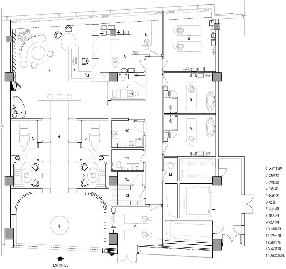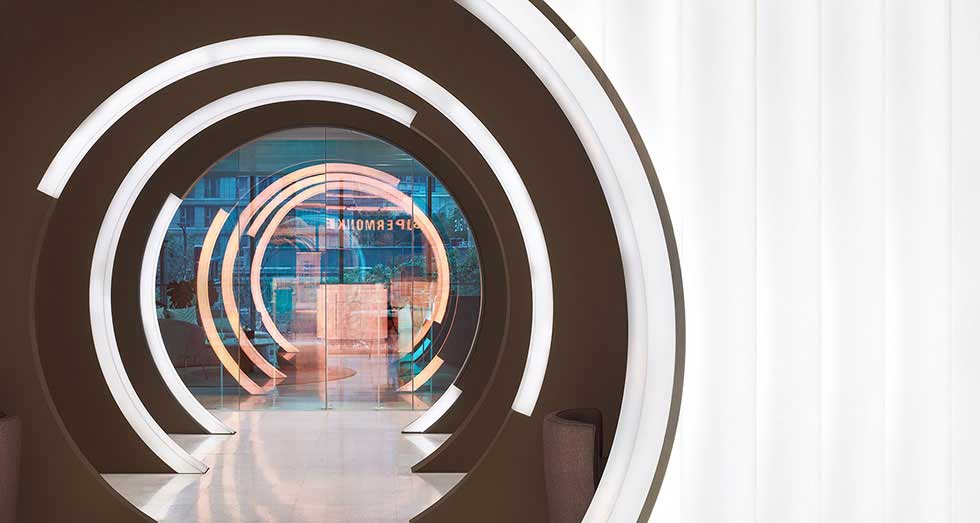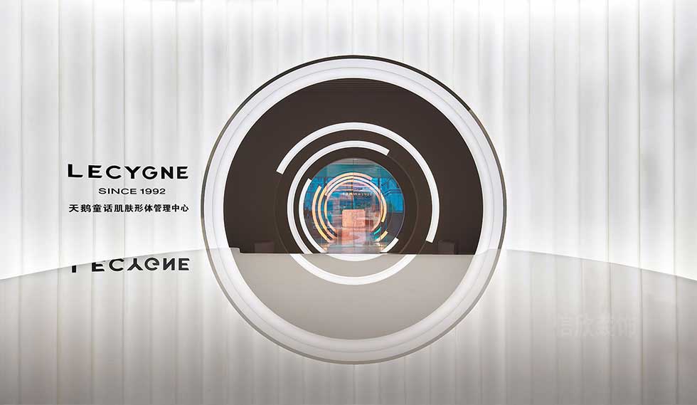 入口通過創造景深將視覺導入到空間,入口產品展示大廳,大面積白色與弧形門洞相疊加,穿梭進入旋轉光圈的弧形門洞,仿佛物質經過時間和空間的流轉而產生內在變化,猶如置身于一條通往美與蛻變的“時光隧道”, 留給人無限的想象與神秘感。空間以近乎純白色調擴容視覺,通過光影、材料、線條的相互關聯,體現多樣變化,同時將優雅和專業的雙重屬性賦予LE CYGNE。