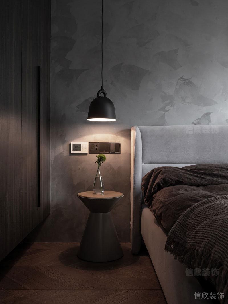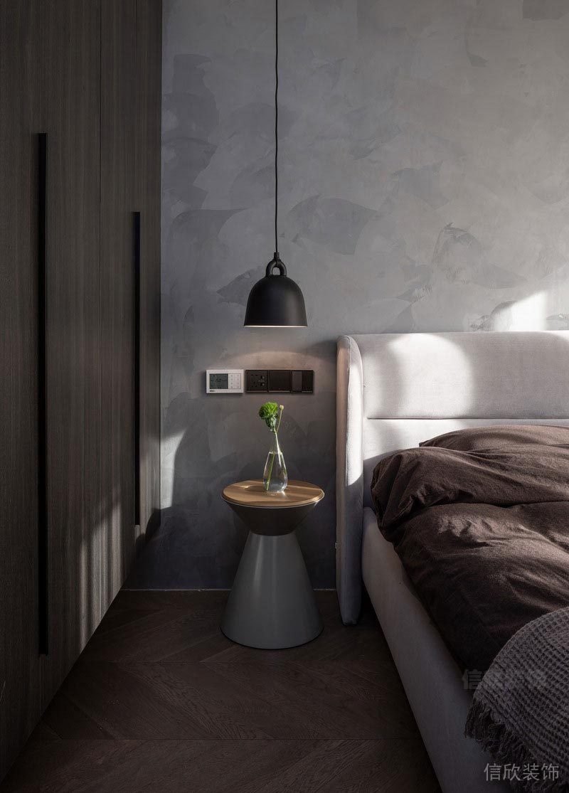 案主睡眠質量不好,所以搭配了深色的床品及窗簾,為了讓人進入主臥后能夠很快的放松精神有助于入睡。