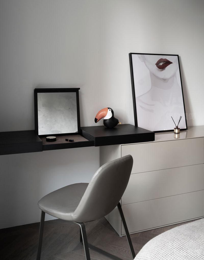 床尾斗柜和梳妝臺的組合滿足了女主人日常整理和梳妝的訴求,折疊式的鏡面小機關可以收納日??诩t及飾品。