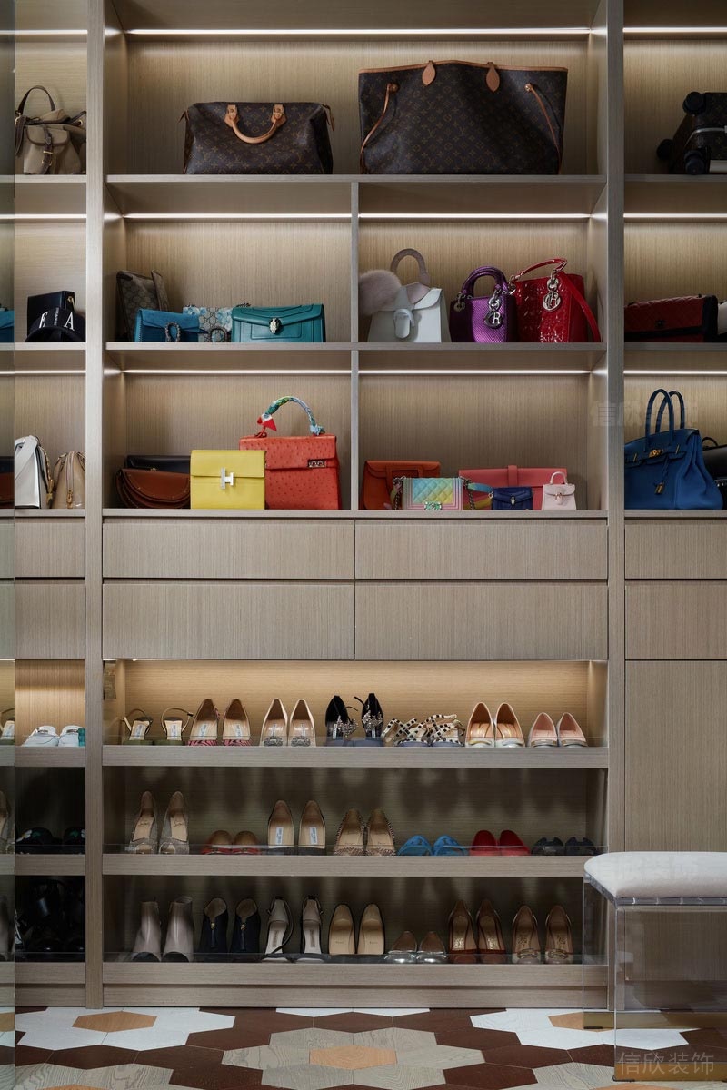 原木色的衣柜,配黑色的茶色玻璃,寬敞的衣帽間,是每一個(gè)精致生活的女人,必備之選。