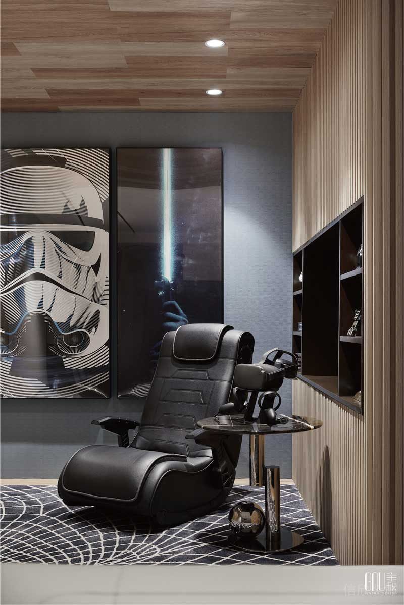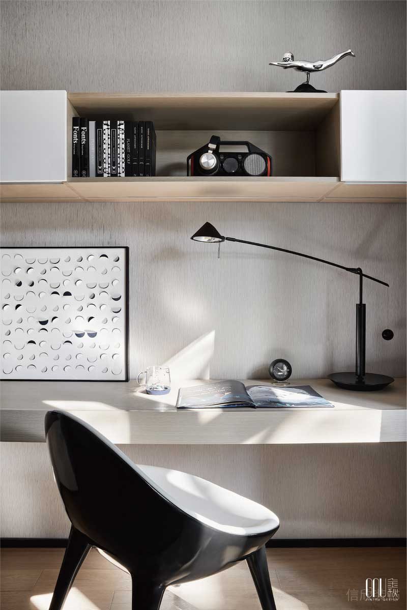 原木系的書房設計,淺色系的木地板和墻面,讓木藝的紋理感完美的展現出來,藍色的小書桌,黑色星點的抽象型落地式背景畫,看似慵懶和隨意,實則每一處都是打動人心的創意。