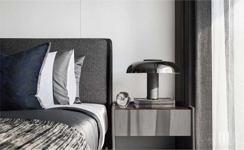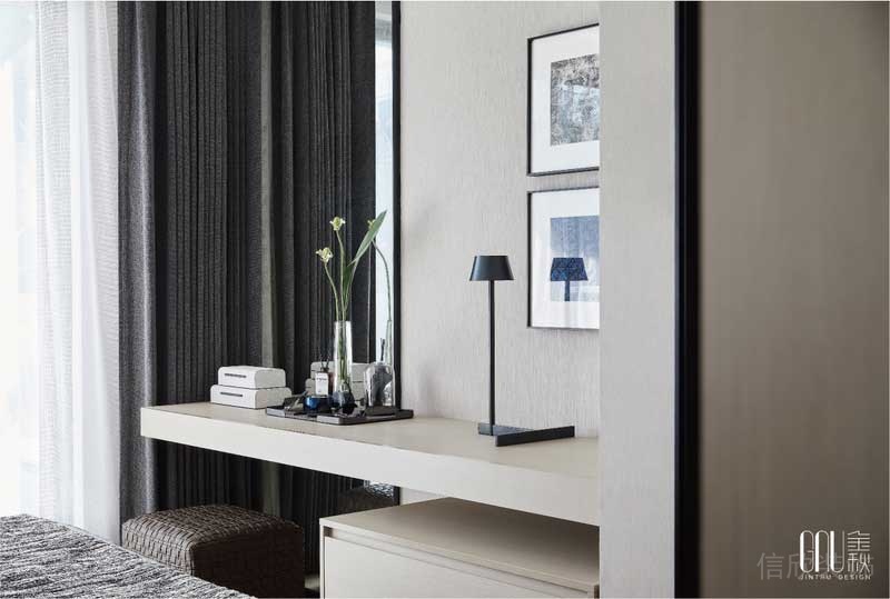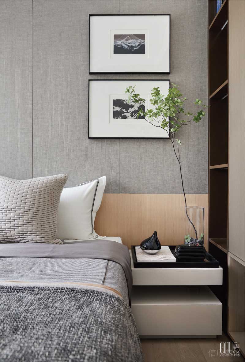 白色的素雅墻面,原木色的地板衣柜,以及灰色的布藝大床搭配,玻璃的衣柜更顯現代的設計理念,實木電視柜的設計,讓人推門進來,就能感受到奢華五星酒酒店客房的高端舒適。
