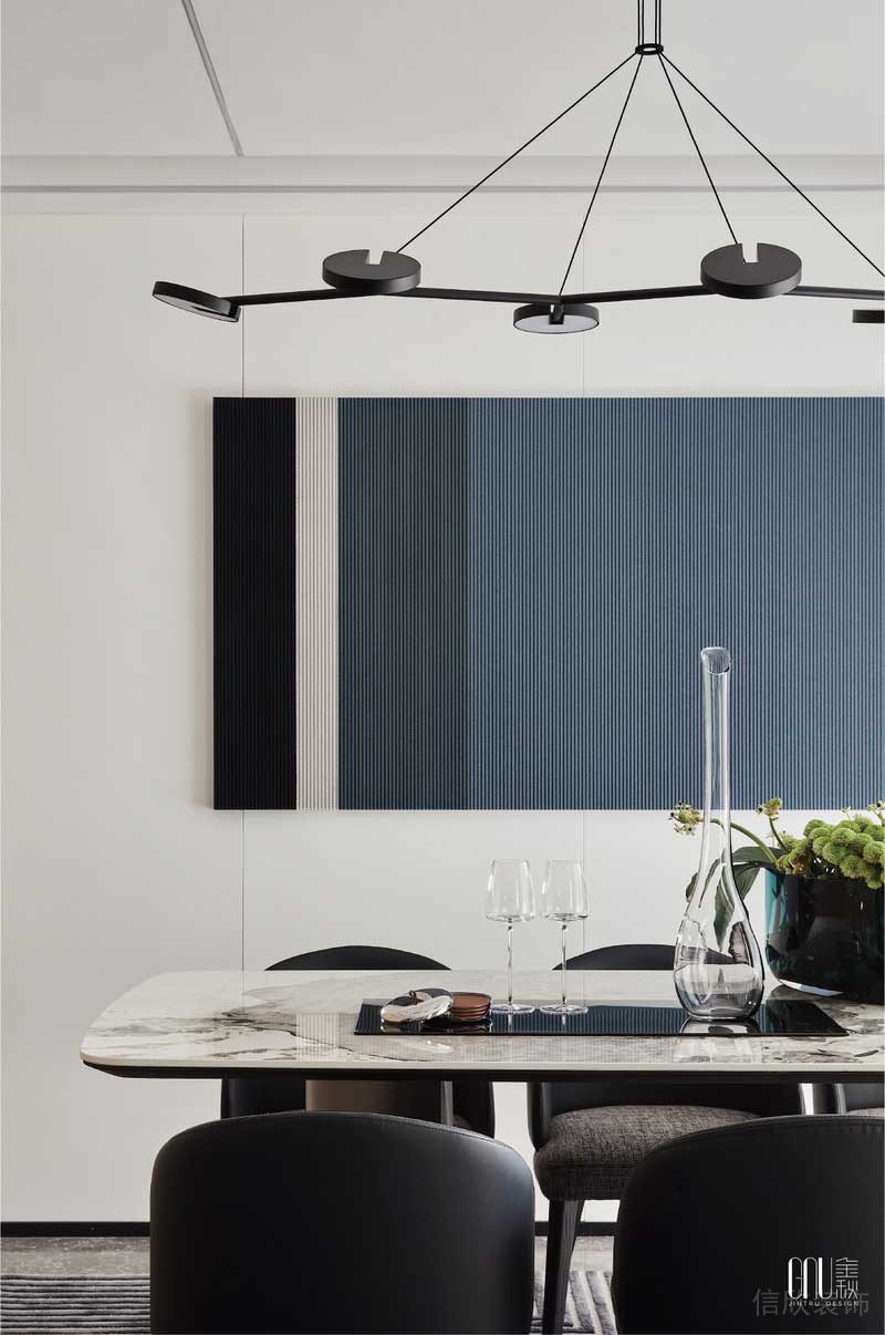 純 白色墻面的餐廳,黑金花天然大理石的地面,搭配黑白回形紋路的地毯,立體感強烈,視覺沖擊效果強,黑色的小餐桌,一整塊白色大理石紋路的桌面,詮釋黑白經典搭配的魅力。