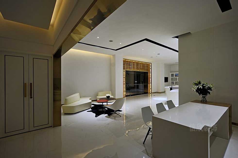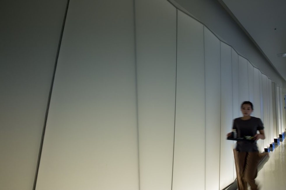 前臺才用雙弧形的設(shè)計,線條感強(qiáng),非常有立體感,在多個射燈的照射下,凸顯出白色天然大理石,自然紋理的美感。