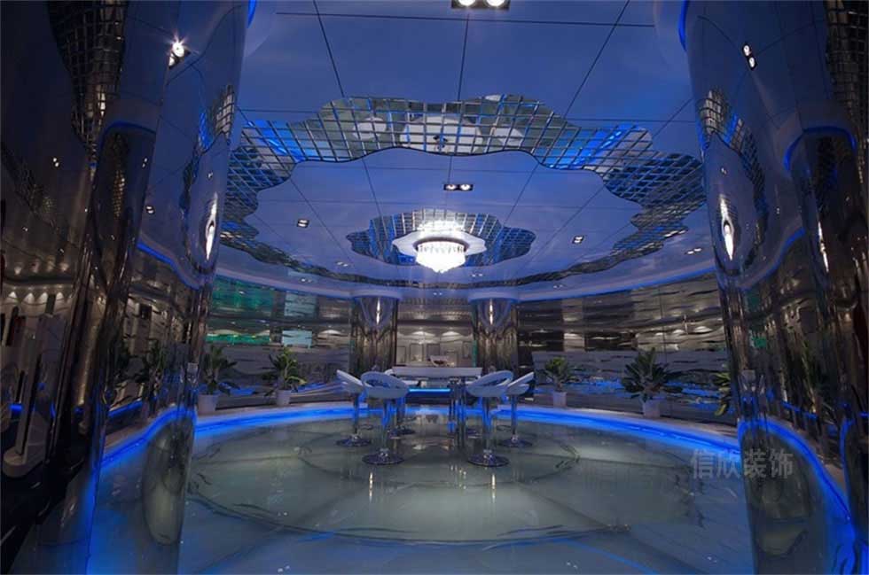 大廳的裝修設(shè)計,鋁扣板和銀色馬賽克材質(zhì)組成的畫師圖形,猶如一朵盛開的鮮花般璀璨奪目,層次分明,每一層都是不同的材質(zhì)變化,銀色不銹鋼的柱子包邊,科技含量十足。