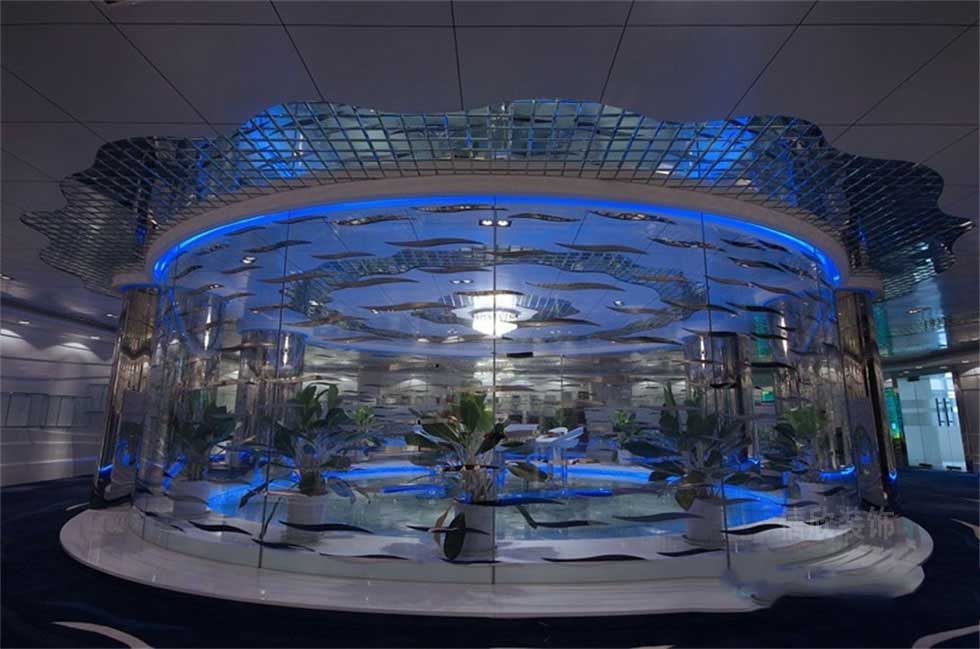 和圓形頂面對應(yīng)的中心展示區(qū),既有凸出重點,又能體現(xiàn)出區(qū)域分隔的妙處,半透明玻璃的材質(zhì),可以起到一定的隱私性,同時從外面看起則是一副似魚兒在游動夢幻般的場景。