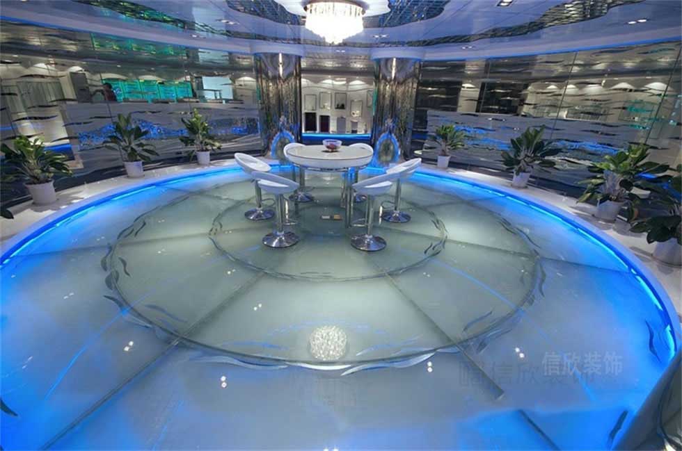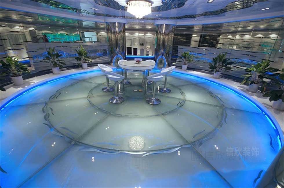 圓形的玻璃房間展區(qū),玻璃的地面在燈光的作用下,泛起微微的藍(lán)色光澤,圓形密封的玻璃外墻,水晶燈主吊燈照射在頂面上,白色圓形的小洽談桌,大圓套小圓的立體設(shè)計模式,前衛(wèi)現(xiàn)代而且給人一種身處于科幻世界中的體驗美感。