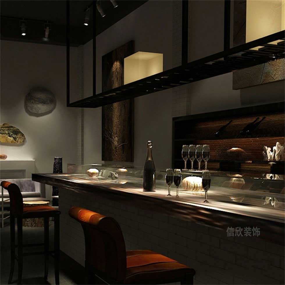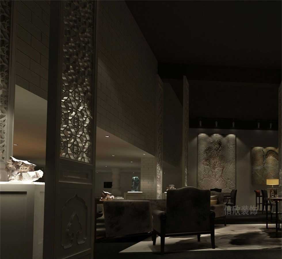 黑色的頂面全部做簡單的噴黑處理,墻面全部刷白,裝上亮度不算太高的射燈作為一個主光源,文化韻味濃厚的墻飾作為簡單的點綴,粗獷中更能體驗原始和天然的寓意。