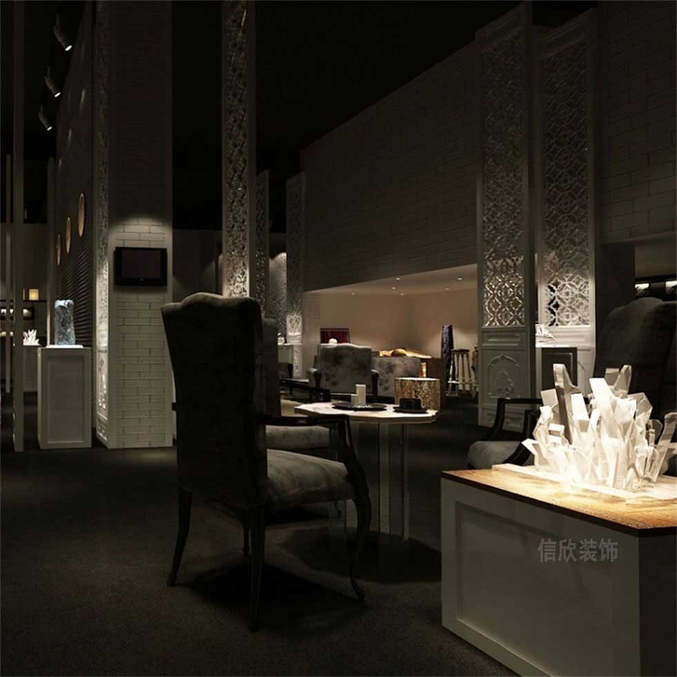寶石展館的裝修設(shè)計,為了在昏暗的光線下襯托出寶石最天然最直觀的美感,采用灰白兩種自然色調(diào)為主體,灰色的地毯,白色的文化石墻面和雕花式的鏤空格調(diào),提煉出一種神秘深邃的氣質(zhì),一種冷色調(diào)的典雅韻味。