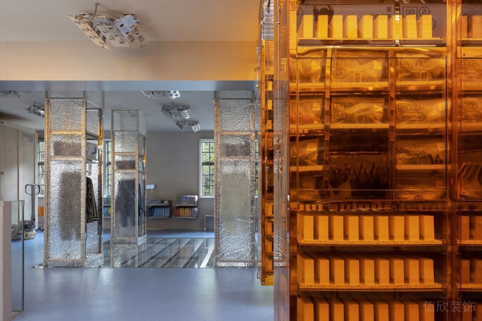 現代風服裝店裝修大廳,中心格柵頂的設計,六根鏤空式的金屬柱子,體現出小眾的設計感。