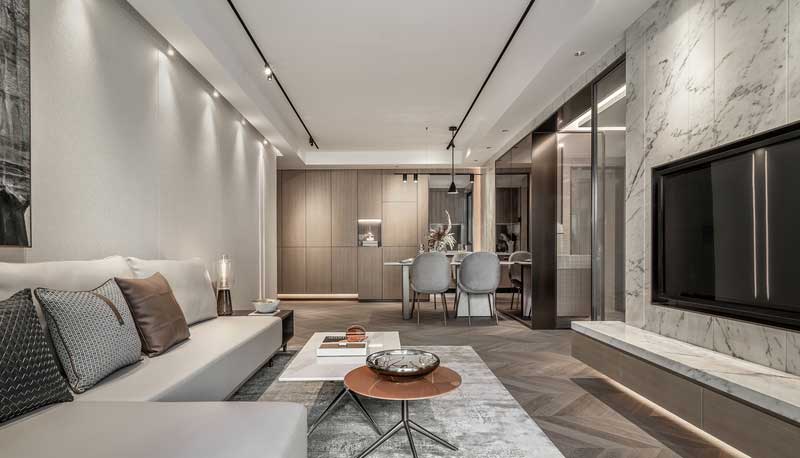 開闊的客餐廳會讓餐桌文化更加充滿熱情, 大理石為灰白色的空間增加了一絲冷靜睿智的氣息, 燈光暖化了整個空間。 是直線或是點碰面又或相互交錯, 給整個空間和布局增加了氣氛, 讓人們在空間內的用餐交談更加舒適自在。