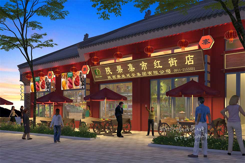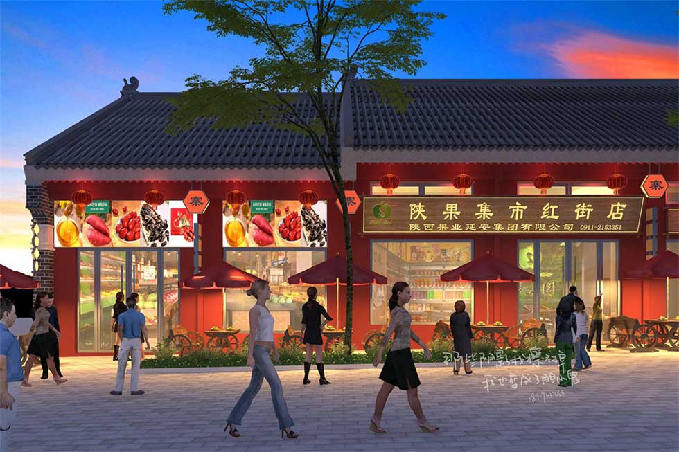 水果店門頭的設計,秉承古典中式傳統設計,秦磚漢瓦的元素,青灰色的磚瓦和三角形的建筑結構,古色古香,回味悠長,紅木的門框,紅色的燈籠,則取一個非常好的開門紅寓意。
